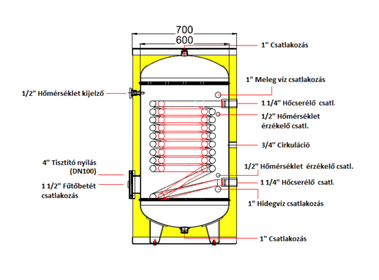 • tartály test hálózati víz és recirkulációs csatlakozásokkal, illetve alsó/oldalsó elhelyezésű tisztító nyílással és leeresztő csatlakozóval