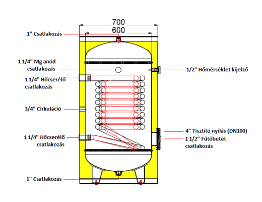 • tartály test hálózati víz és recirkulációs csatlakozásokkal, illetve alsó/oldalsó elhelyezésű tisztító nyílással és leeresztő csatlakozóval