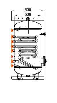 -Használati meleg víz előállítás viszonylag gyorsan indirekt módon vagy kiegészíthető elektromos fűtőbetéttel is (6/4"). A beépített 0,6 m2 és 0,35 m2 felületű hőcserélő spirálnak köszönhetően, akár egy 5 tagú család használati meleg víz igényét is biztonsággal kiszolgálja a berendezés