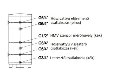 • 2 soros 4 pontos csonkozású 180°-ban elforgatott 6/4”-os belső menetes csatlakozók, további 1 db 6/4"-os felső csatlakozóval, 1 db 3/4"-os leeresztő csatlakozással és 1 db 1/2"-os mérőhüvellyel HMV szenzorhoz