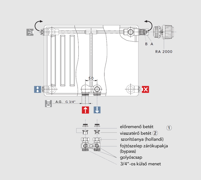 A beépített szelepes változat esetében a kötéstávolság, az előremenő és a visszatérő csatlakozás között 50 mm. A hőteljesítmény az MSZ EN 442 szerinti (75 °C előremenő, 65 °C visszatérő és 20 °C szobahőmérséklet) teljesítményadatok Watt-ban, egyoldali- ill. keresztoldali csatlakozások esetében érvényesek.
