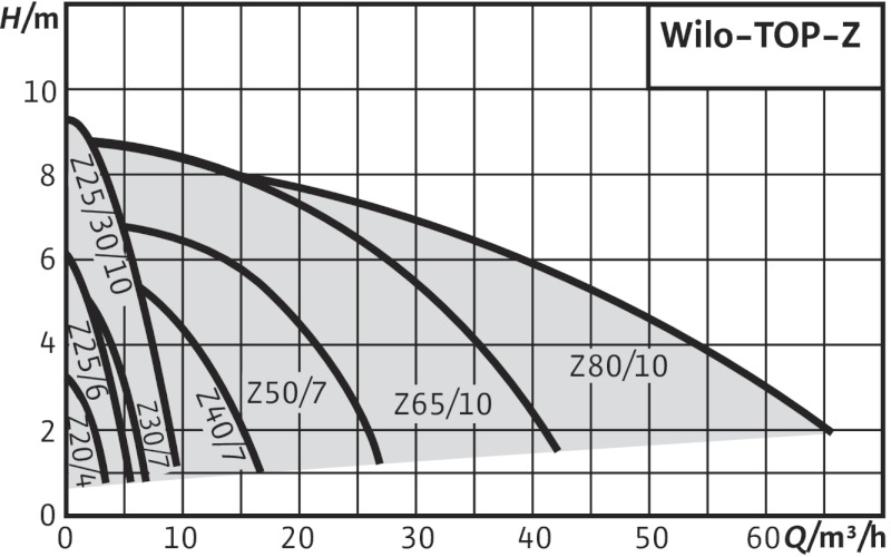A Wilo TOP-Z sorozatú szivattyúi átkapcsolható fordulatszámú nedvestengelyű használati és fűtési víz keringető szivattyúk. Ezek a típusok tartós, megbízható, használati és fűtési víz keringetésére alkalmas szivattyúk. Használhatóak mindenféle cirkulációs rendszerekbe, lakossági, ipari és épülettechnikai területen. A szállított közeg hőmérséklete, használati melegvíz esetén a maximum +80°C-ot, míg fűtési víz esetén a minimum -10°C-ot és a maximum +110°C-ot érheti el.