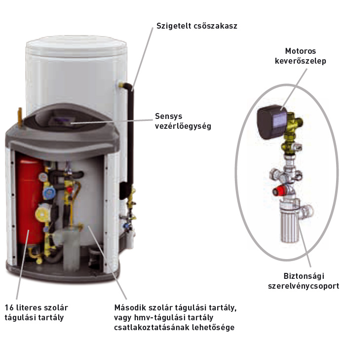 A Sensys vezérlőnek köszönhetően a rendszer teljes működését egy helyről irányíthatjuk és ellenőrizhetjük. A motoros keverőszelep segítségével a kívánt melegvíz hőmérséklet is könnyen szabályozható.