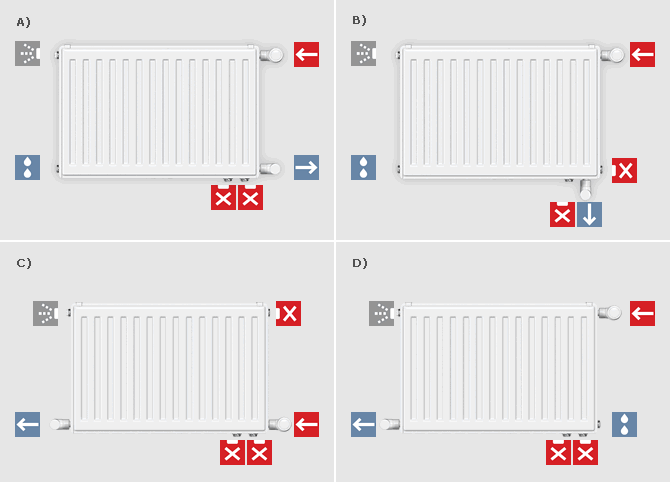 Valamennyi higiéniai szelepes radiátor a hátoldalán felhegesztett felfüggesztő füllel van ellátva. Minden típus felfüggesztő fülekkel ellátott és igény szerint szelepes radiátorként alul jobb illetve bal oldalon, vagy kompakt radiátorként is beköthető. A beépített szelep, a légtelenítő, leeresztő és a vakdugók, gyári tartozékok.